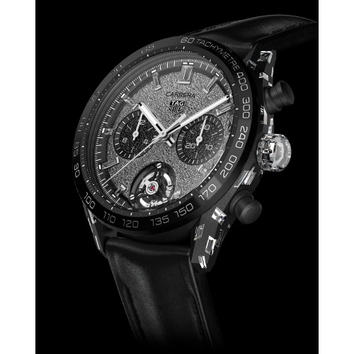 The TAG Heuer Carrera CBN5A90.FC6540, part of the Carrera collection, features an anodized aluminum case adorned with lab-crown diamonds and a ceramic bezel engraved with a tachymeter scale. Powered by the TAG Heuer Calibre Heuer 02T Nanograph movement, this watch offers hours, minutes, small seconds, chronograph, column wheel, chronometer, and tourbillon escapement functions. Produced in 2022, this timepiece is a blend of avant-garde design and precision engineering. For those seeking a high-quality replica, this model is available at a cheap price on sale in China, offering AAA craftsmanship.